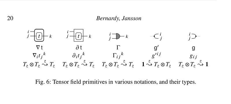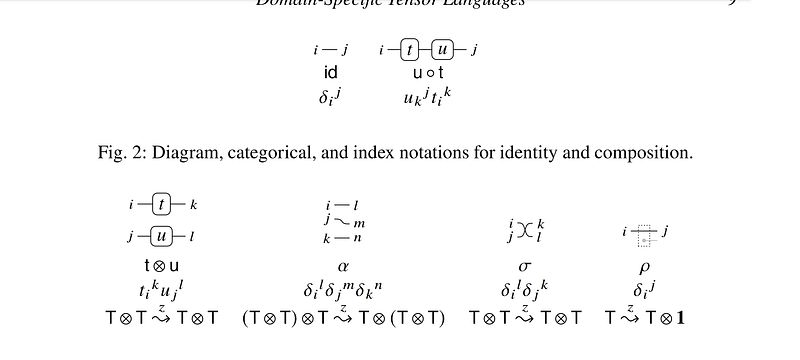 The paper explains tensor algebra and tensor calculus with two DSLs embedded in Haskell: one called Albert (after Einstein) for the Einstein tensor notation (made famous 100 years ago by the papers on general relativity and curved space-time) and one called Roger (after Penrose) for the underlying category theory morphisms. One unusual feature is that the DSL expressions can be rendered as diagrams by the Haskell library. The first image below shows the main tensor algebra diagrams and the second show the main tensor calculus diagrams.